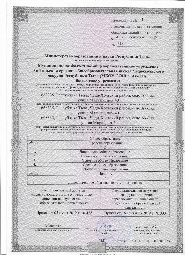 В Соответствии со Свидетельством о государственной аккредитации, выданного 04 июня 2015 года Министерством образования и науки Республики Тыва в МБОУ СОШ с.Ак-Тал реализуются следующие уровни образования: