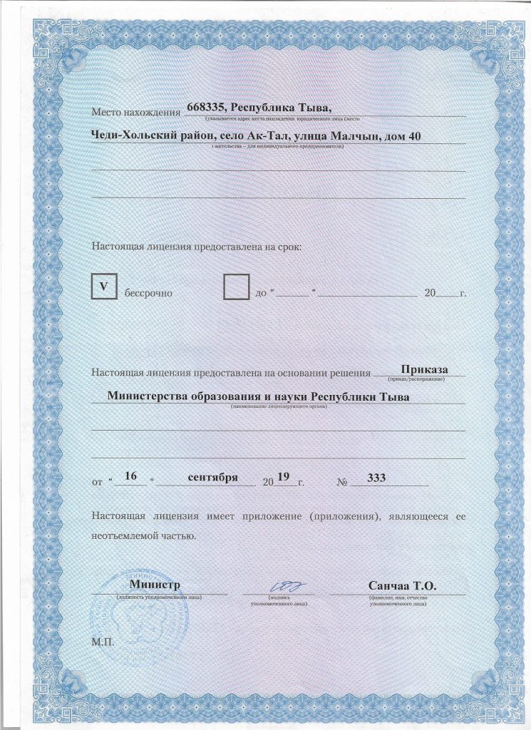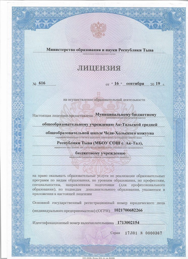 В Соответствии с Лицензией на осуществление образовательной деятельности №475, выданного 30.11.2016 г Министерством образования и науки Республики Тыва и Устава школы в МБОУ СОШ с.Ак-Тал обучение реализуется в очной форме
