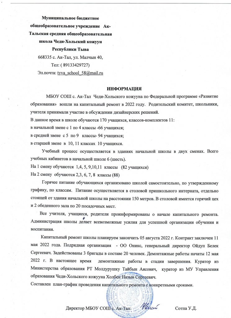 668335, Республика Тыва, Чеди-Хольский район, с. Ак-Тал, ул. Малчын, 40. Телефон: 89133429727
