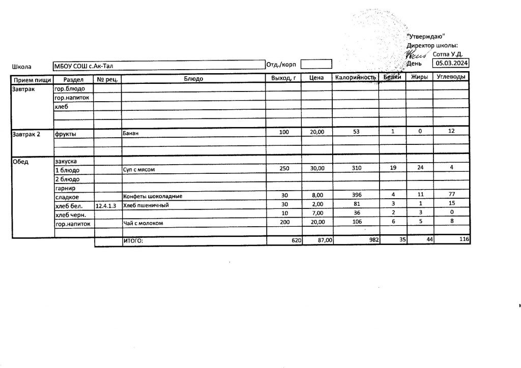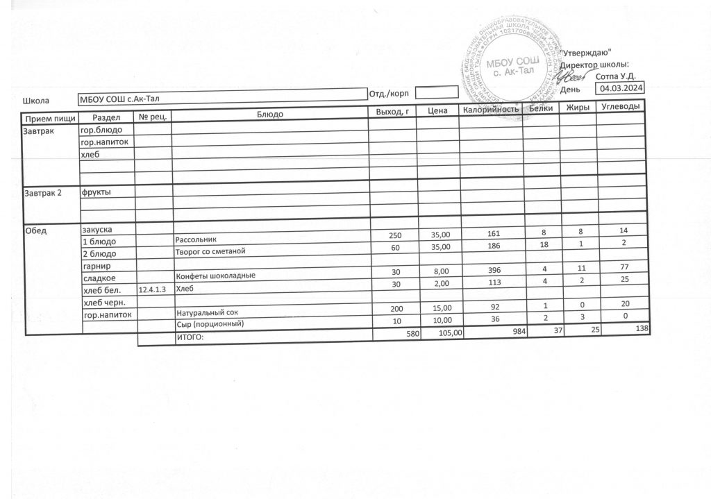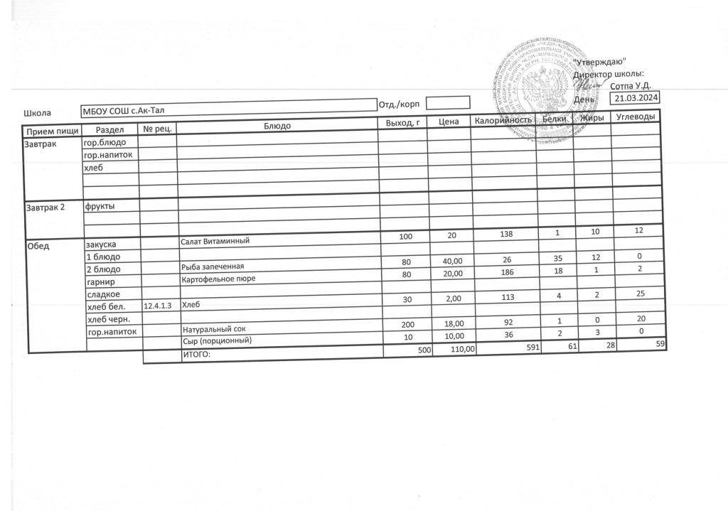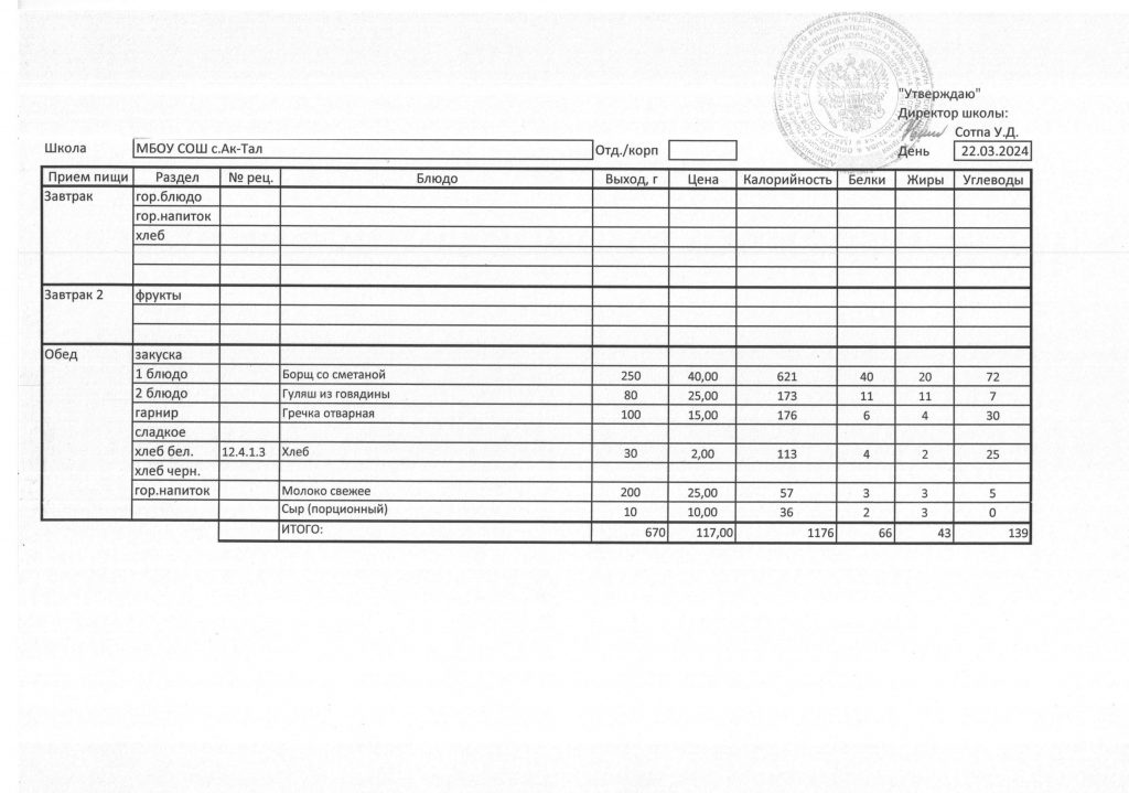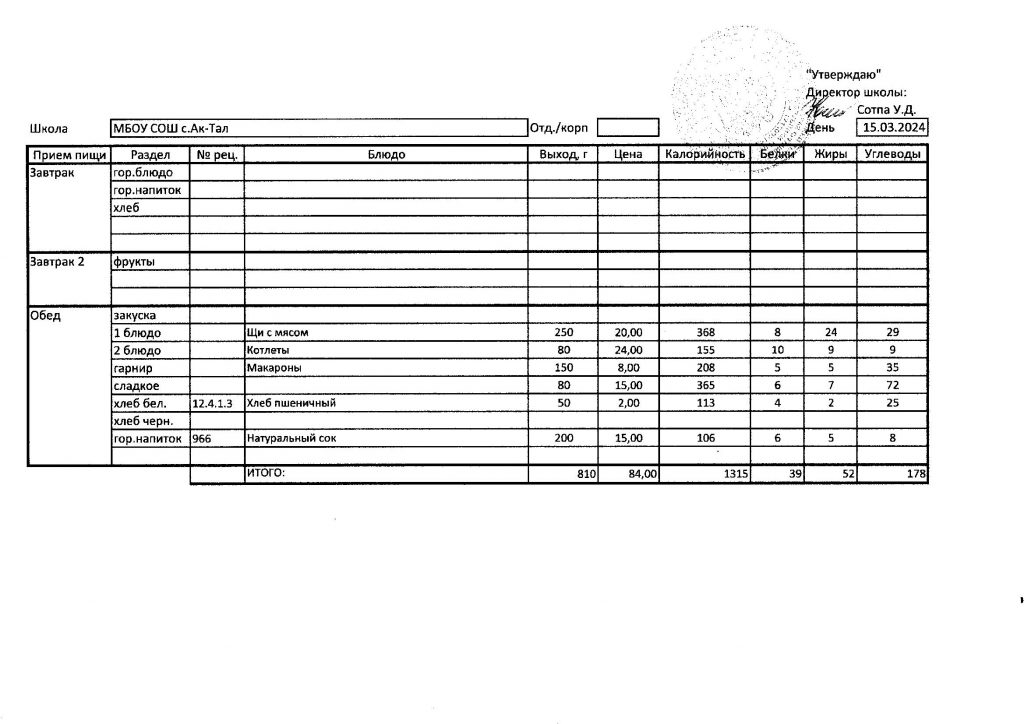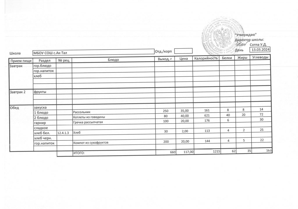 10-дневное меню МБОУ СОШ с. Ак-Тал утвержденное