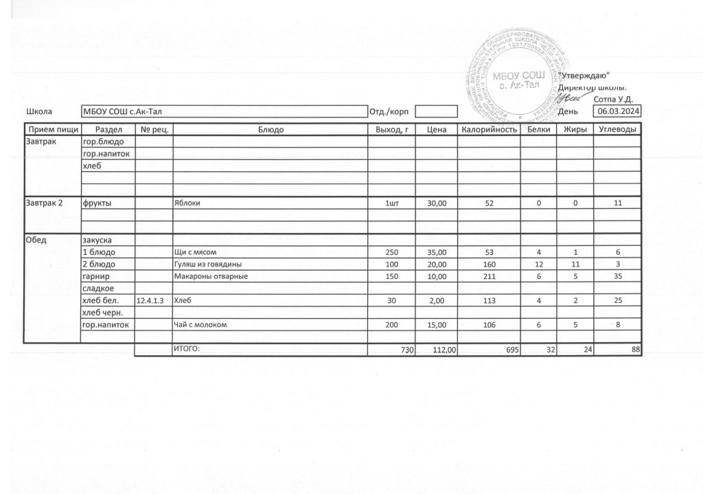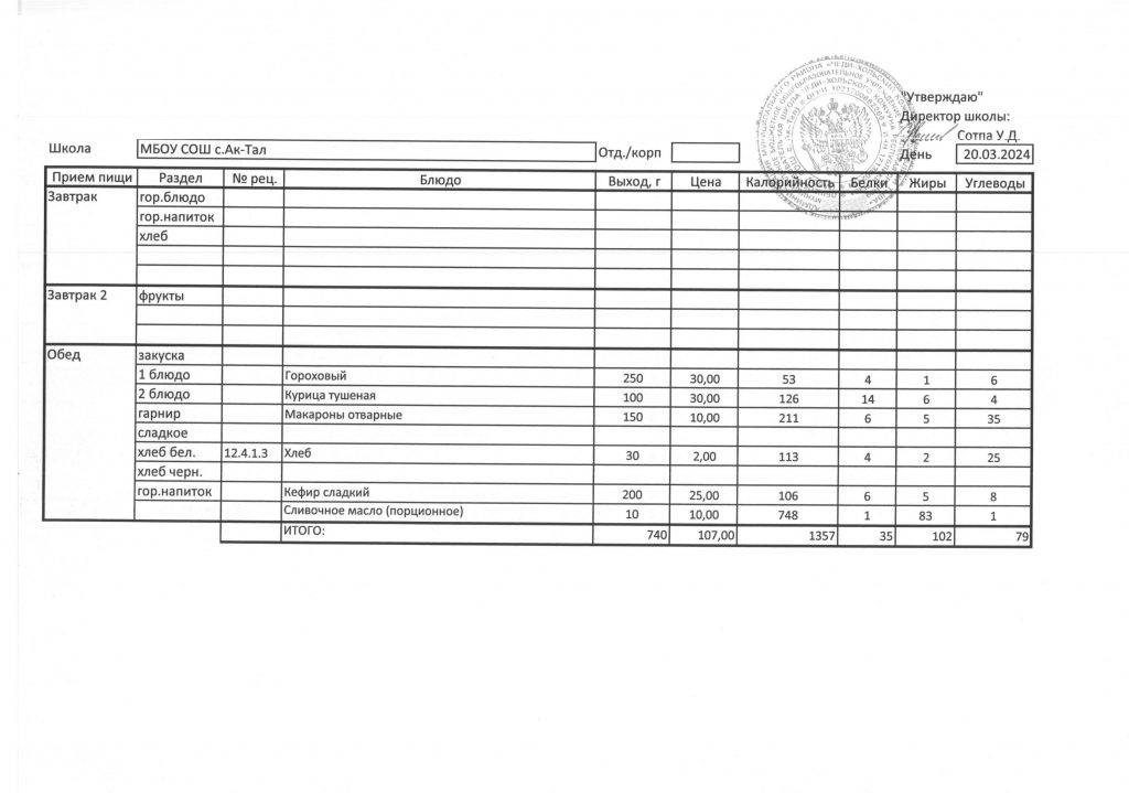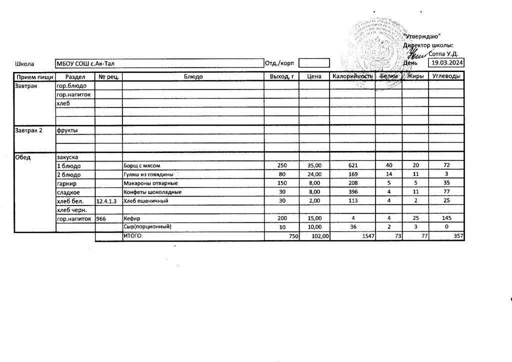 Утвержденное ежедневное меню