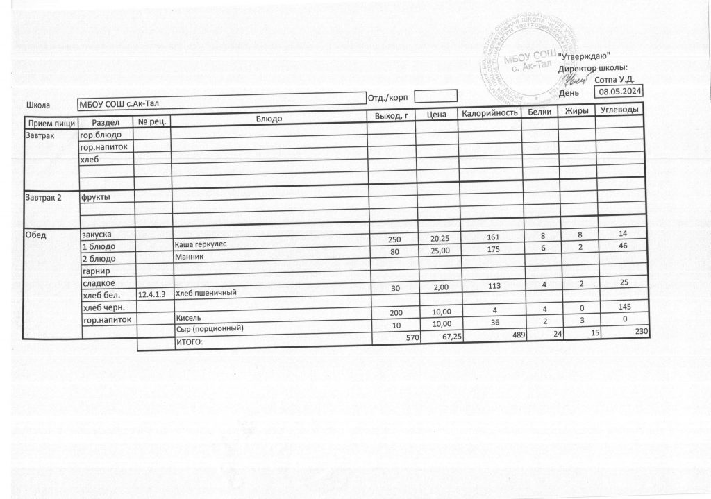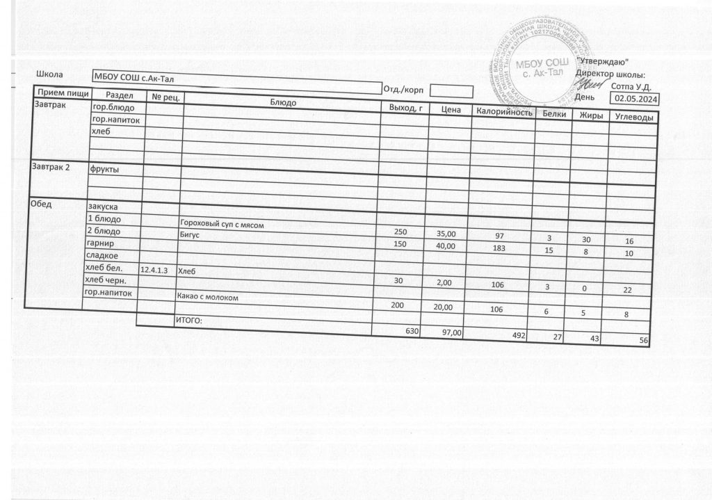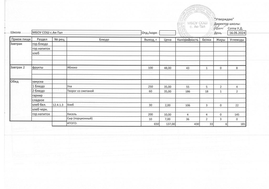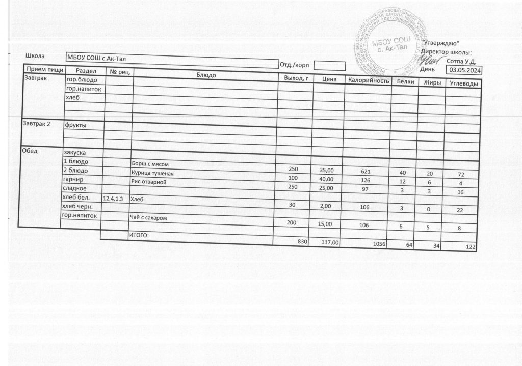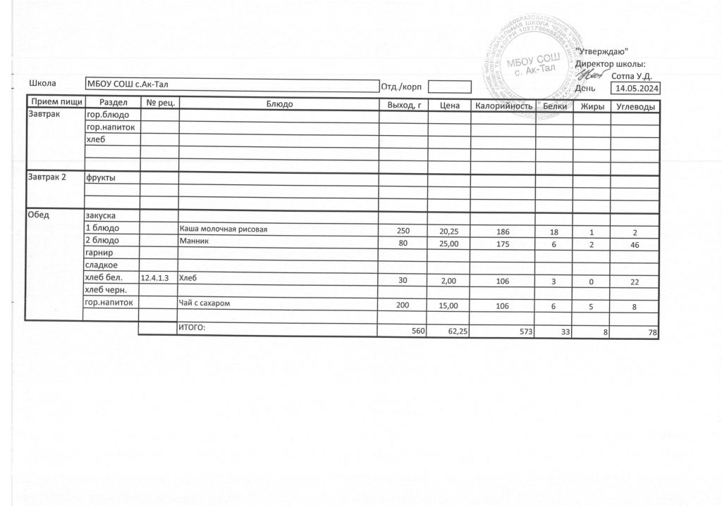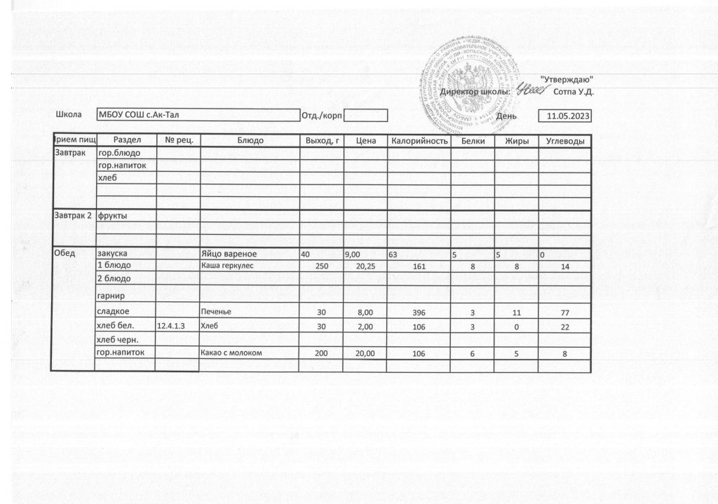 10-дневное меню МБОУ СОШ с. Ак-Тал утвержденное